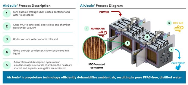 AirJoule® utilizes a Metal Organic Framework (“MOF”) and a patented system to produce dehumidified air and pure, distilled water, PFAS-free, from air. In turn, the pure, PFAS-free, distilled water and the dehumidified air can be used for a variety of applications, including air conditioning, evaporative cooling, drinking water, and water for industrial or agricultural purposes.